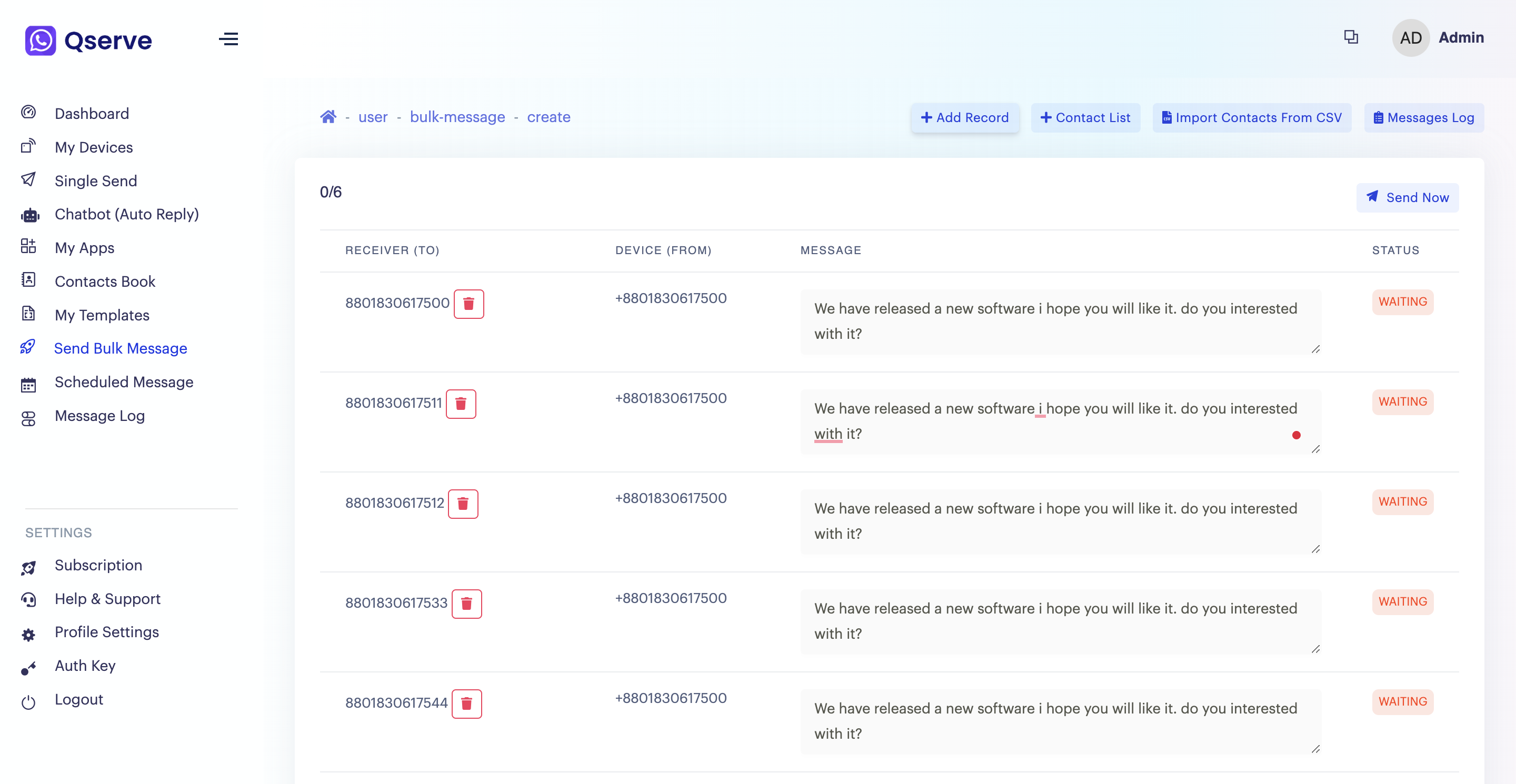 La mensajería WA Bulk es la difusión de una gran cantidad de mensajes para su entrega al software WASender. Lo utilizan empresas de medios, bancos y otras empresas y marcas de consumo para diversos fines, incluidos entretenimiento, marketing empresarial y móvil.